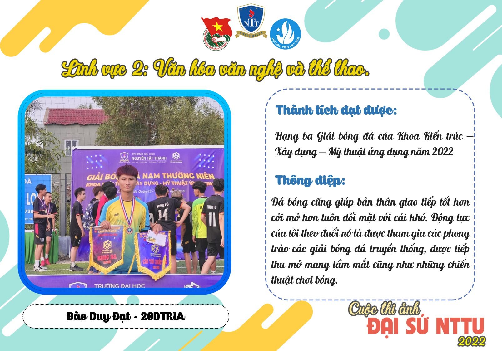 Tôi xin được giới thiệu: Tên là Đào Duy Đạt, sinh năm 2002 và đến từ Đắk Lắk hiện tại đang học lớp 20DTR1A ngành Kiến trúc của khoa Kiến Trúc – Nội Thất – Mỹ Thuật Ứng Dụng tại trường đại học Nguyễn Tất Thành. Sở thích cũng như là đam mê của tôi là chơi thể thao mỗi khi rảnh, thể thao ở đây là nói chung cũng như là đá bóng truyền thống nói riêng. Bóng đá một môn thể thao phổ biến rất quen thuộc với hầu như tất cả con người và xã hội nên tôi cũng có một tinh thần chơi bóng đá rất nhiệt tình, tuy là thể thao nhưng nó cũng mang lại những cơn đau những nổi buồn, những khát vọng luôn cháy trong tâm hồn luôn làm cho tôi thêm sự thích thú về nó không kể mọi khó khăn. Tuy vậy đá bóng đem lại sự giải trí sau những giờ stress hay những thứ gì đó vui vẻ mới lạ tiếp thu được kinh nghiệm, cũng có thể làm quen được nhiều bạn mới, nó giúp bản thân trở nên săn chắc hơn sức khoẻ hơn hoà nhập với cuộc sống hơn. Đá bóng cũng giúp bản thân giao tiếp tốt hơn cởi mở hơn luôn đối mặt với cái khó. Động lực của tôi theo đuổi nó là được tham gia các phong trào các giải bóng đá truyền thống, được tiếp thu mở mang tầm mắt cũng như những chiến thuật chơi bóng. Cũng như đợt qua, tôi có tham gia Giải bóng đá nam truyền thống cấp khoa năm 2022 một cơ hội để thể hiện bản thân trước những thầy cô khán giả và mọi người. Tôi đã cố gắng hết mình cùng đồng đội đạt được giải ba của khoa , cảm xúc lúc đó có một chút gì đó nỗi buồn nhưng bù lại là những lời khen và động viên tinh thần. Tôi rất tự hào về bản thân cũng như là môn thể thao đá bóng đã xuất hiện để có thể show được những tài năng của mình, bên cạnh đó cũng được gia đình và mọi người đặt niềm tin vào mỗi lần tham gia thi đấu , những cảm xúc nó như là hạnh phúc nhất của thời sinh viên và cũng cảm ơn một mái trường luôn tạo điều kiện cũng như luôn tạo ra những sân chơi thể thao cổ vũ tinh thần , trao những niềm vui để các bạn như tôi luôn theo đuổi đam mê trên hành trình chinh phục những giấc mơ khi còn ngồi trên giảng đường Đại học. Tôi xin trân trọng cảm ơn./”