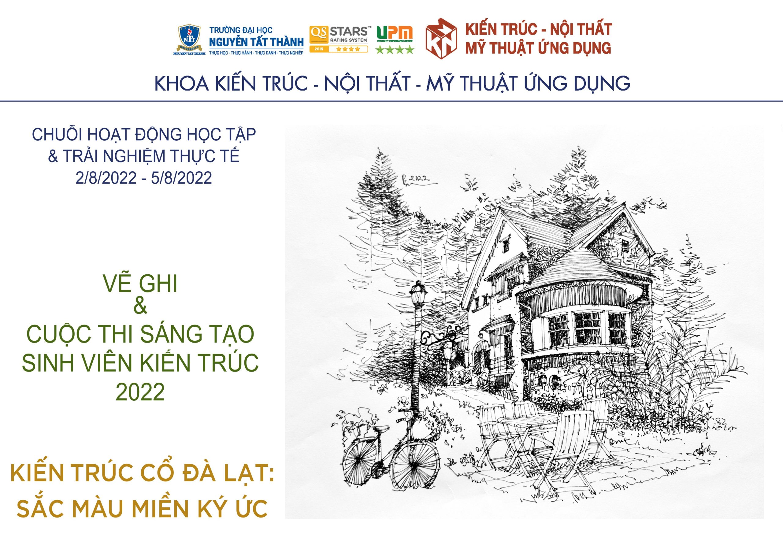Chuỗi hoạt động Học tập và trải nghiệm ngoại khóa: Vẽ ghi và Cuộc thi sáng tạo Sinh Viên (SV) Kiến Trúc (KT), hoạt động thương hiệu hàng năm cùa ngành Kiến trúc Đại học Nguyễn Tất Thành đã chính thức khởi động vào ngày 30/07/2022 bằng buổi giảng đề của các thầy Bộ môn KT và Talkshow: “Di sản Đà Lạt” của cô Hạnh Nguyên – Trưởng Khoa với tham dự của đông đủ SV 2 lớp K20 và K21 ngành KT và sẽ tiếp tục kéo dài đến 05/08/2022 theo lịch trình.