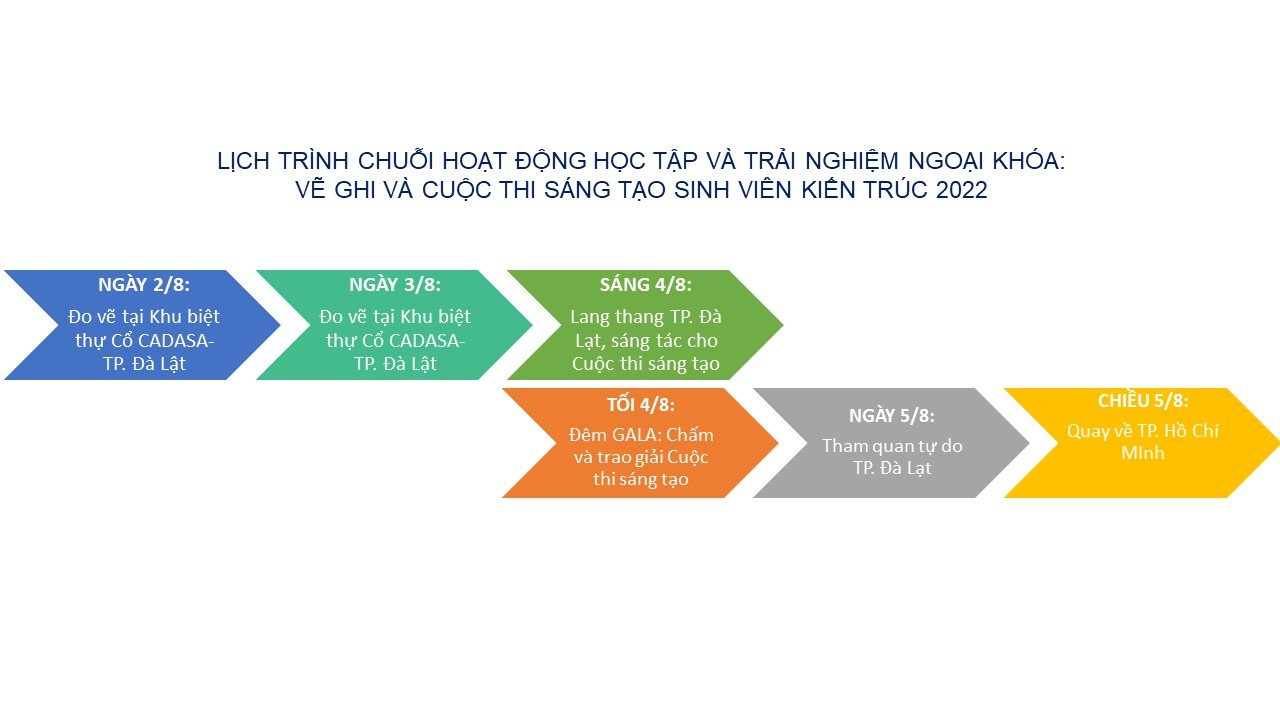 Trong Chuỗi hoạt động Học tập và Trải nghiệm ngoại khóa năm nay tại thành phố Đà Lạt, các bạn SV sẽ được các thầy cô trang bị và hướng dẫn thực hành những kiến thức cần có về công tác vẽ ghi một công trình kiến trúc, bên cạnh có cơ hội để trải nghiệm lang thang Đà Lạt và thỏa sức sáng tạo Ký họa công trình kiến trúc tại Đà Lạt với những phân tích, suy ngẫm, cảm xúc về các giá trị của công trình trong Cuộc thi sáng tạo Sinh Viên Kiến Trúc 2022 với chủ đề “Kiến trúc cổ Đà Lạt: Sắc màu miền ký ức”.