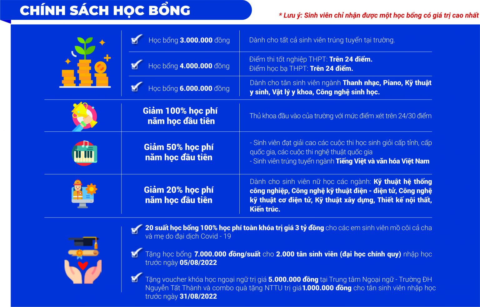 Năm 2022, trường Đại học Nguyễn Tất Thành sẽ dành nhiều suất học bổng có giá trị tương đương 20%, 50% và 100% học phí năm học đầu tiên cho các thí sinh trúng tuyển vào Trường theo các phương thức xét tuyển khác nhau.
